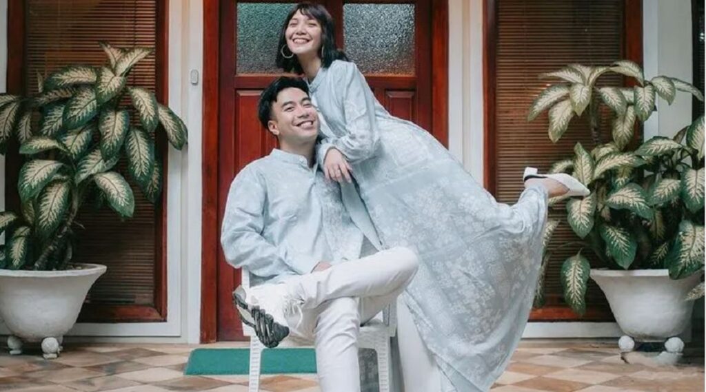 Pasangan yang baru menikah ini terlihat sangat kompak dengan baju lebaran bernuansa abu-abu. Dilengkapi dengan motif batik berwarna putih, membuat keduanya terlihat elegan dan simpel, cocok dengan karakter mereka yang masih muda.